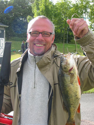 | Sidste års vinder Jesper Melander startede ved Daka, men fik ingen fisk derude. Kl 12. tog han indtil havnen, hvor han fangede en del aborrer, men kun op til 200 gr. |